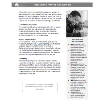 Free practice tests are available for the parent educator to download. These are in the form of a PDF file that can be printed and given to the student. They include the test, a bubble sheet, instructions, and an answer key. The practice tests contain a few questions in each subject area. They help familiarize the student with the testing process and provide a sampling of the content they will encounter. Full length work booklets are available for Grades 1-7 from the Spectrum Practice Test series. For Grade 8 we have a Test Prep work booklet from Flashkids/Harcourt Family Learning. There are practice workbooks for Grades 9-12 available as well.